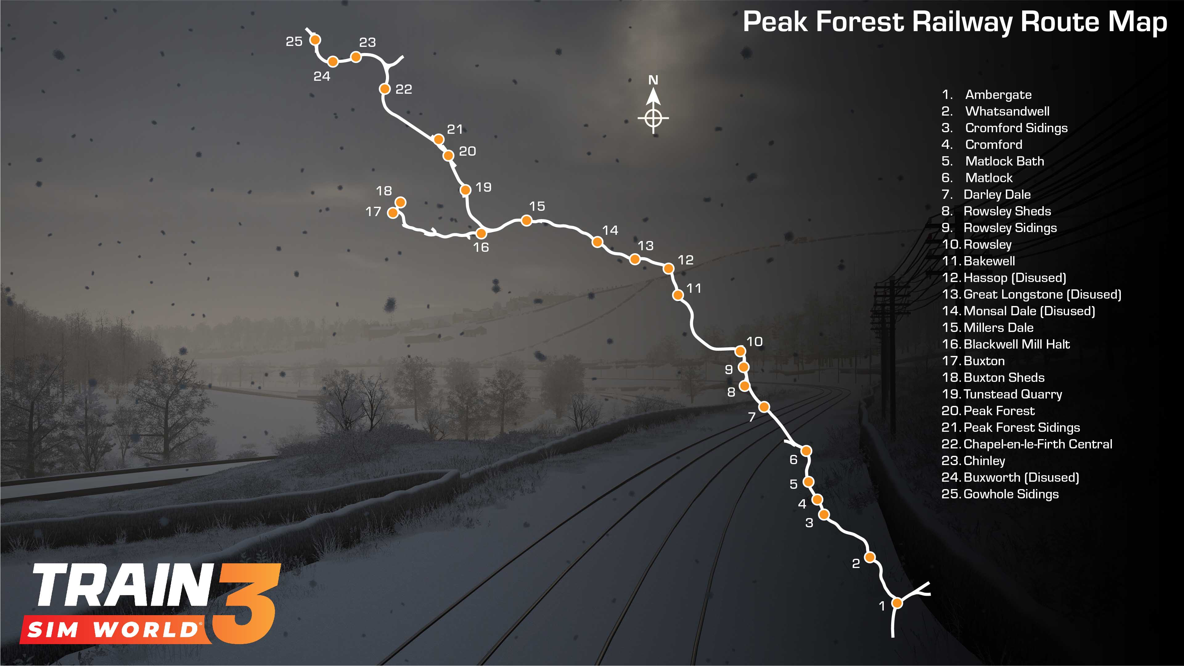 Train Sim World 3: Peak Forest Railway: Ambergate – Chinley & Buxton will cover the line from Ambergate to Chinley, places both with current stations on the railway network, but with the line linking them now segmented into various uses – from an extant passenger branch line (to Matlock), a heritage railway, a footpath / cycle track and parts of a dedicated freight line.