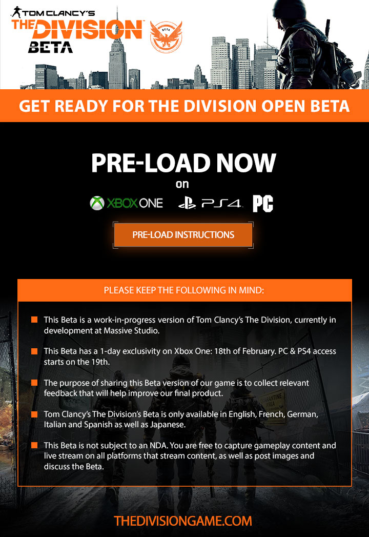 - http://www.xboxone-hq.com/news/956-the-division-s-open-beta-is-now-available-for-pre-load-on-all-platforms.html